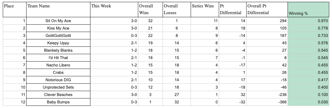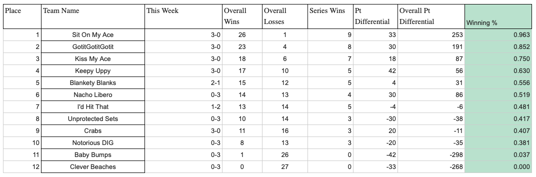 The format is best of 3, with games to 21. If a 3rd game is necessary, that game is to 15. Teams in 1st and 2nd place have a 1st round bye. Gold bracket will have their semis this Wednesday. Silver bracket will only play the 1st round this Wednesday and have their semis and finals on the same night, the following Wednesday.